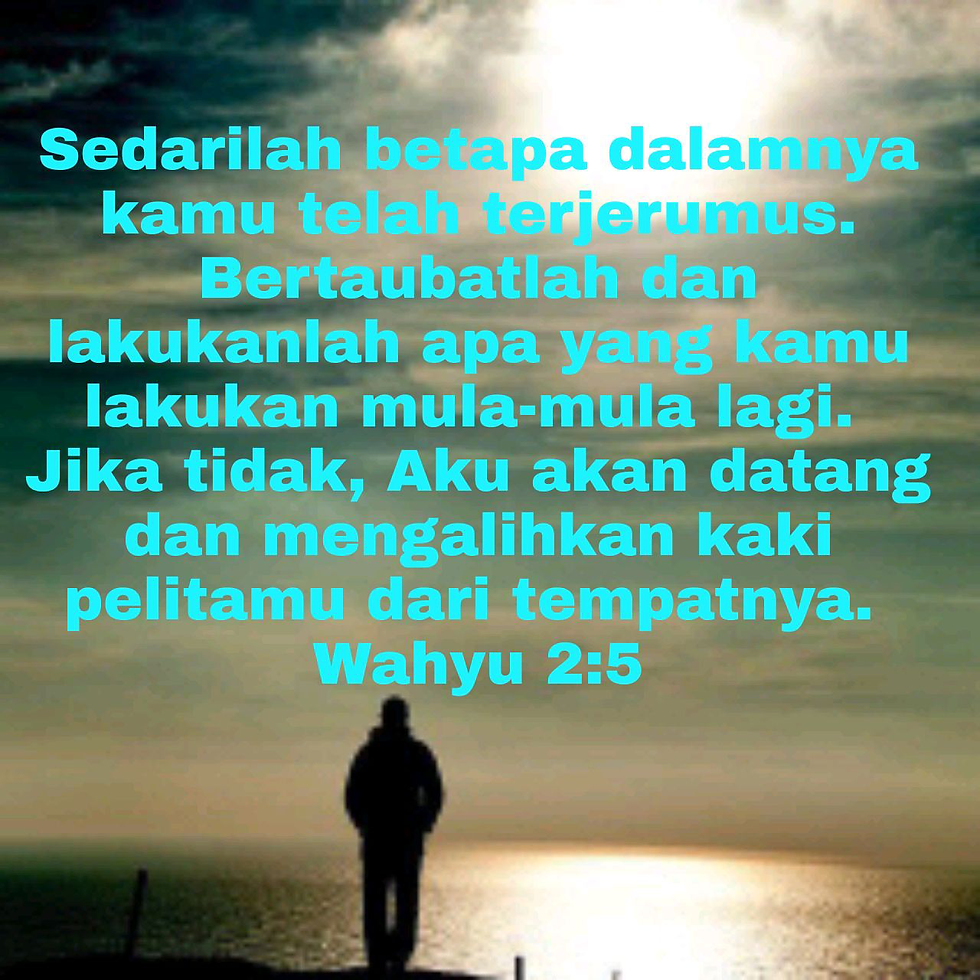 Sedarilah betapa dalamnya kamu telah terjerumus. Bertaubatlah dan lakukanlah apa yang kamu lakukan mula-mula lagi. Jika tidak, Aku akan datang dan mengalihkan kaki pelitamu dari tempatnya.