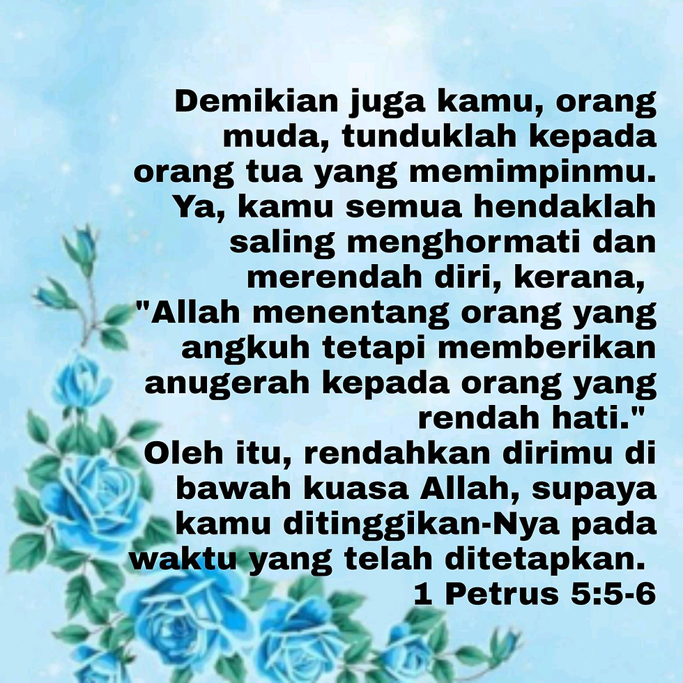 Demikian juga kamu, orang muda, tunduklah kepada orang tua yang memimpinmu. Ya, kamu semua hendaklah saling menghormati dan merendah diri, kerana, "Allah menentang orang yang angkuh tetapi memberikan anugerah kepada orang yang rendah hati." Oleh itu, rendahkan dirimu di bawah kuasa Allah, supaya kamu ditinggikan-Nya pada waktu yang telah ditetapkan.